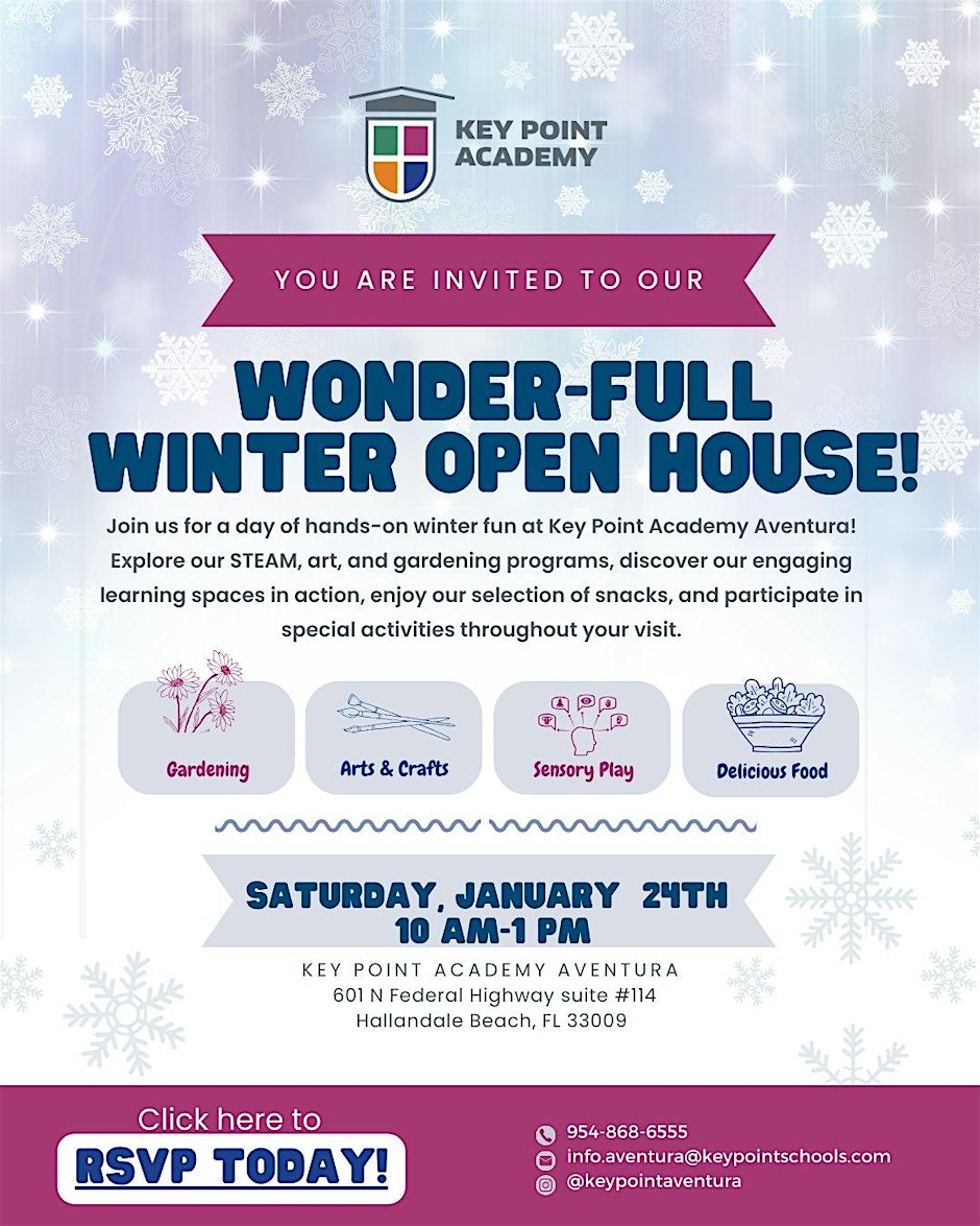 Join us for a day of hands-on winter fun at Key Point Academy Aventura! Explore our STEAM, art, and gardening programs, discover our engaging learning spaces in action, enjoy our selection of snacks, and participate in special activities throughout your visit.