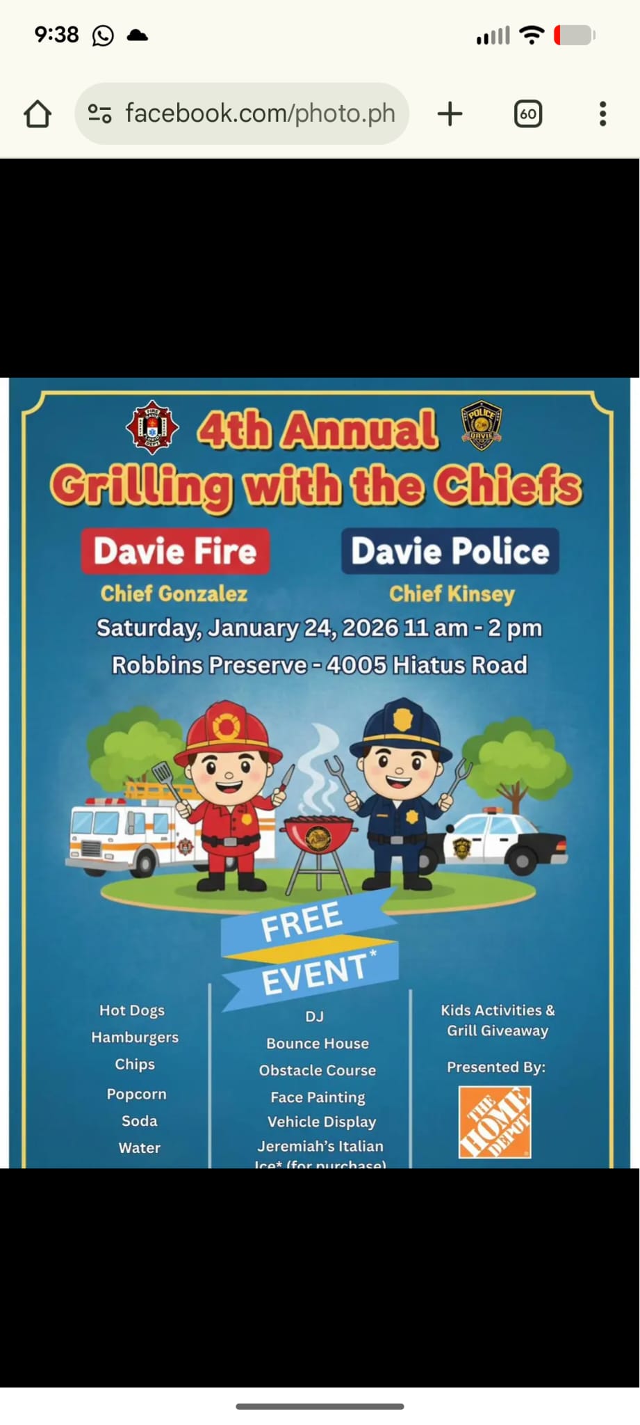 Join the Davie Police Department & Fire Department for this free event for the whole family! Features include Hot Dogs, Hamburgers, Chips, Popcorn, Soda, Water, DJ, Bounce House, Obstacle Course, Face Painting, Vehicle Display, and a Grill Giveaway with Davie Fire Rescue Department. Food items (Jeremiah's Italian Ice) also available for purchase.