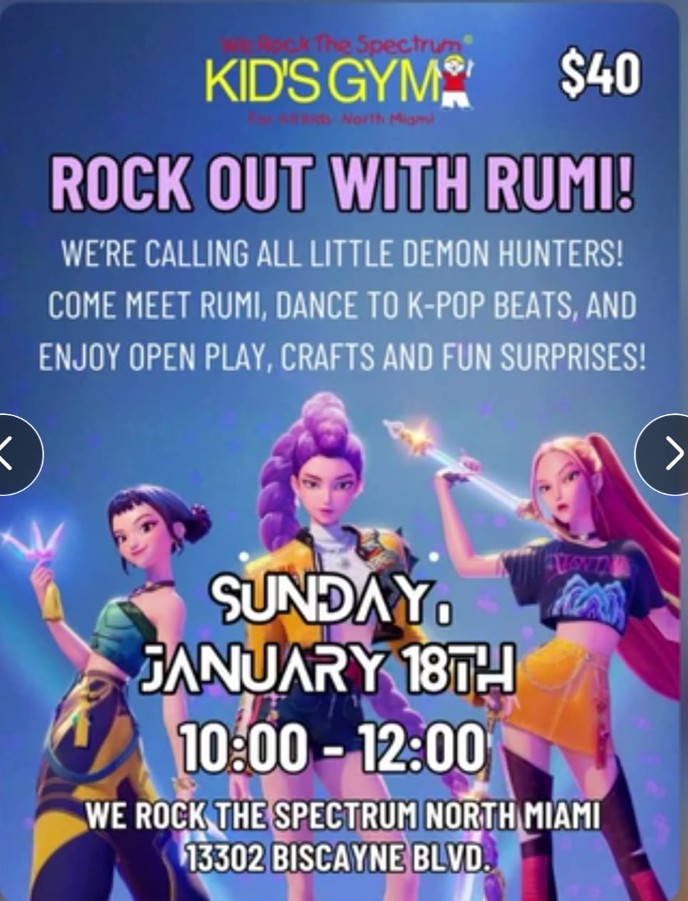 We're calling all little demon hunters! Come meet Rumi, dance to K-pop beats, and enjoy open play, crafts and fun surprises!