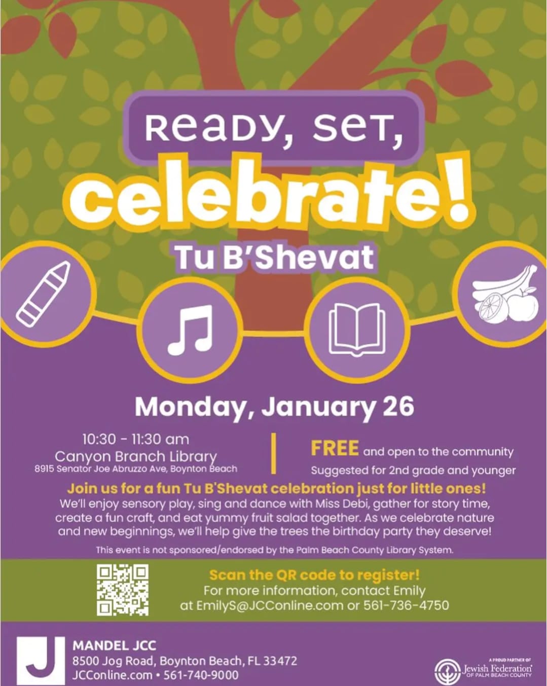 Join us for a fun Tu B'Shevat celebration just for little ones! We'll enjoy sensory play, sing and dance with Miss Debi, gather for story time, create a fun craft, and eat yummy fruit salad together. As we celebrate nature and new beginnings, we'll help give the trees the birthday party they deserve!