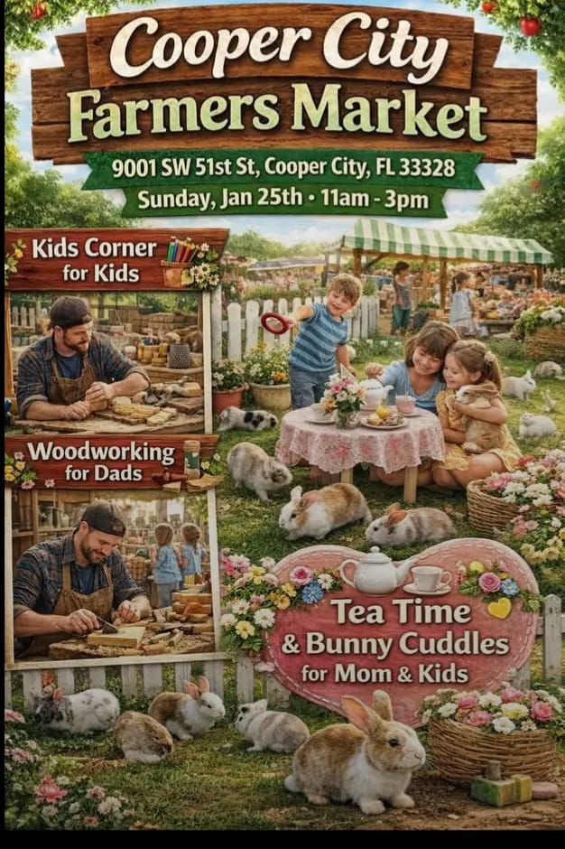 Join us for the Cooper City Farmers Market! Features include a Kids Corner, Woodworking for Dads, and Tea Time & Bunny Cuddles for Mom & Kids.