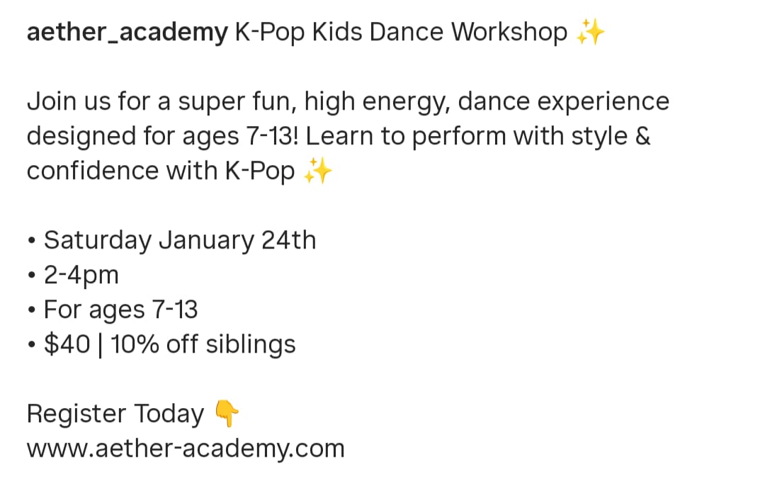 Join us for a super fun, high energy, dance experience designed for ages 7-13! Learn to perform with style & confidence with K-Pop.