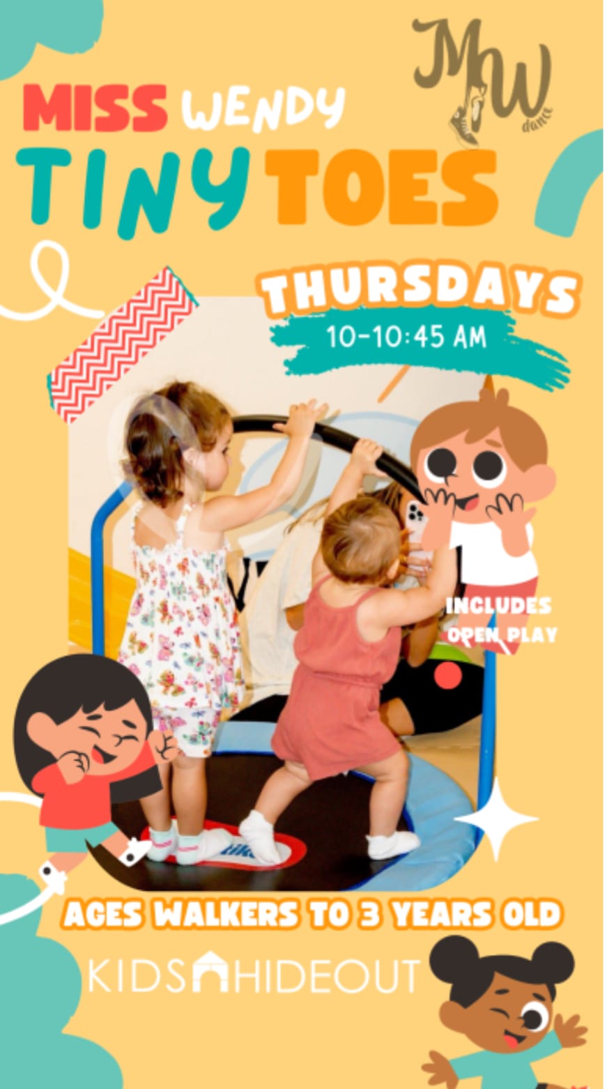 Single class - Thursdays 10:00 am (Recommended for walkers - 3 years old) with Classes 45 minutes. In this class, your child will develop coordination and learn beginner gymnastics skills. They'll participate in warm-ups, practice movements across the floor, and work on balance using fun gymnastics props like balance beams, mats, stepping stones, trampolines, and hoops. Along the way, they'll build self-confidence while note having a great time! Includes open play.
