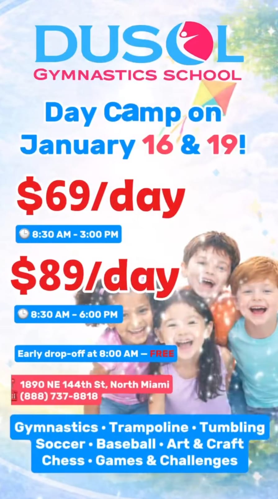 Includes Gymnastics, Trampoline, Tumbling, Soccer, Baseball, Art & Craft, Chess, Games & Challenges. Early drop-off at 8:00 AM is FREE.